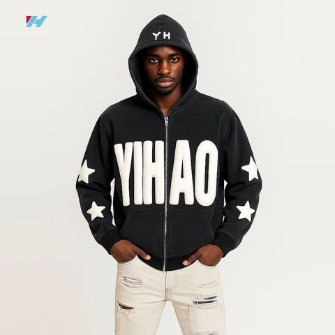 Hersteller Custom Sample 500 Gsm 450 Gsm Französisch Terry Streetwear Kleidung 70% Baumwolle Puff Print Zip Up Hoodie